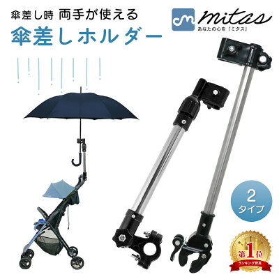 日傘用のアームスタンドをベビーカーに取り付ければ、片手がふさがることなく安心です。赤ちゃんにもママにも影が届く位置に調整できるものが便利です。